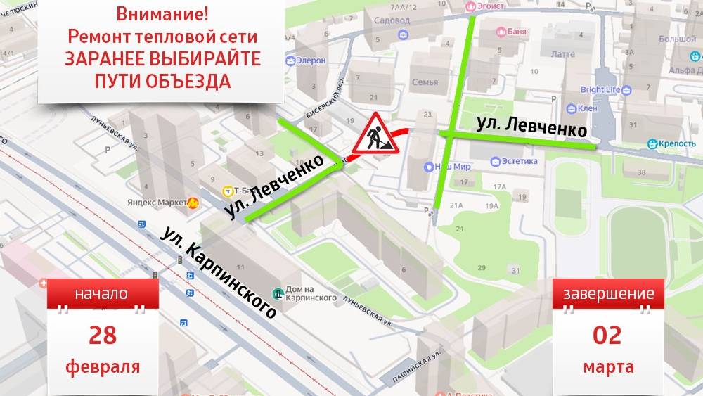 На время работ с 06:00 28 февраля до 06:00 02 марта будет перекрыт проезд в обе стороны по улице Левченко на участке от перекрестка с улицей Капитана Гастелло до Бершетского переулка.