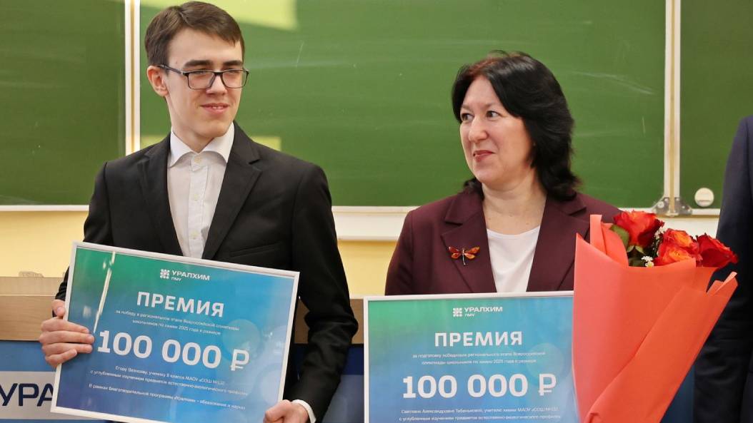 В рамках благотворительной программы «Уралхим» — образование и наука» премии от филиала «ПМУ» по 100 000 рублей получили победитель регионального этапа Всероссийской олимпиады школьников по химии — ученик школы № 132 г. Перми Егор Вазисов и его учительница химии Светлана Тебенькова.
