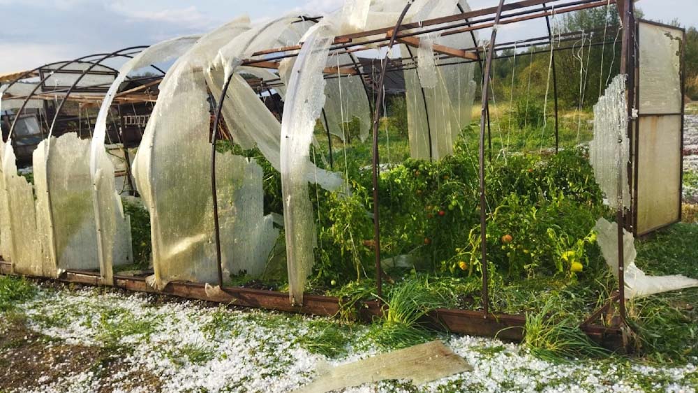 Град был крупный, порядка 3 см. При этом, со слов очевидцев, отдельные градины были размером с куриное яйцо - это около 7-8 см. Льдины даже пробивали крыши теплиц, были повреждены заборы и деревья. Градовый покров не мог растаять более часа, оставаясь в виде толстого белого слоя.