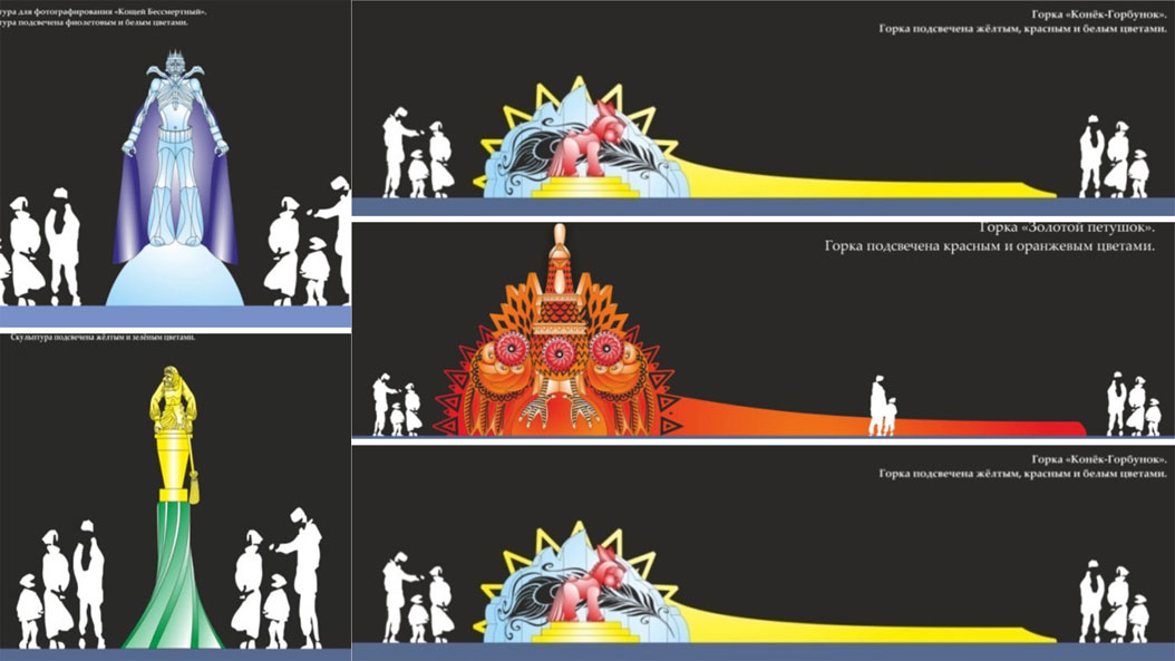 Ледовый городок на пермской эспланаде в этом году будет посвящен сказочным персонажам. К 28 декабря в центре Перми планируется построить 15 ледовых объектов: покатушку «Море вздуется бурливо…», горки разной высоты «Царевна Лебедь», «Избушка на курьих ножках», «Чудо-юдо рыба-кит», «Шамаханская царица», «Золотой петушок», «Золотая рыбка», «Белка песенки поет», «Конек-Горбунок», «Молодильные яблочки», скульптуры для фотографирования Баба Яга», «Кощей Бессмертный», «Птица Сирин», «Птица Алконост» и «Птица Гамаюн».