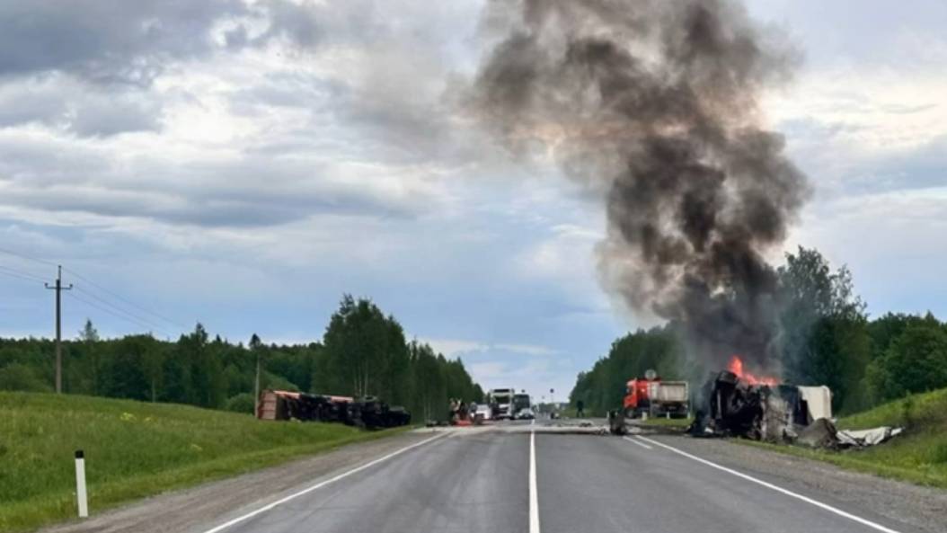 Вечером 4 июня на трассе «Полазна — Чусовой» произошло ДТП с участием двух грузовиков. По предварительной информации, водитель «Скани» попытался избежать столкновения с неустановленным легковым автомобилем, неожиданно включившим поворот, и выехал на встречную полосу, где врезался в грузовик «Ситрак». В результате произошло возгорание одного из большегрузов.