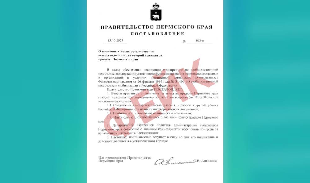 В Прикамье появились фейки о запрете на выезд мужчин за пределы региона. В соцсетях распространяется фото постановления, якобы подписанного и.о. председателя Правительства Ольгой Антипиной. В тексте поддельного документа говорится о введении временного запрета на выезд за пределы региона мужчин в возрасте от 18 до 30 лет.