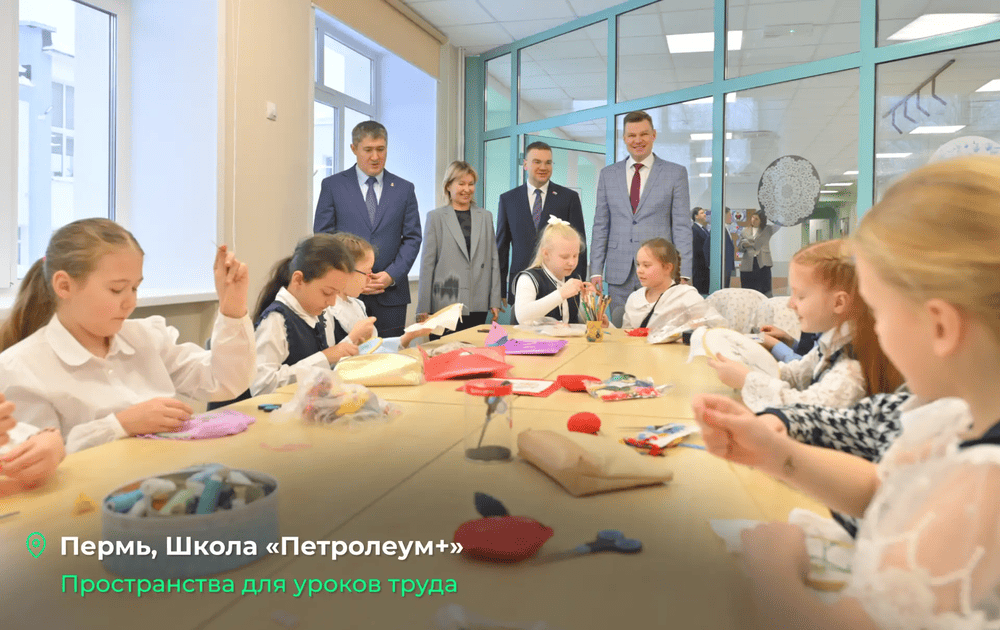 В школе «Петролеум+» на шоссе Космонавтов, 195 после ремонта были обновлены инженерные системы и помещения школы. Коридоры школы оформили в концепции федеральных проектов «Школа Минпросвещения России» и «Лица героев». «Создан центр детских инициатив для работы детских объединений. Появилась новая спортивная инфраструктура: лыжная база, скоро откроется зал самбо. Оборудованы две новых замечательных мастерских для девочек и для мальчиков, в которых ребята смогут заниматься на уроках труда», - отметил директор школы «Петролеум+» Артем Исаков.