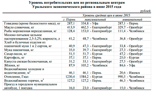 На потребительском рынке товаров и услуг в Пермском крае прирост цен с начала года составил 7,9% (в целом по России – 8,5%). В Пермском крае, как и в других регионах Урала наиболее быстро дорожали продовольственные товары - увеличение цен на них составило 10,6%. Самая высокая стоимость фиксированного набора потребительских товаров и услуг оказалась в Свердловской области и Пермском крае - 12676 и 12387 рублей соответственно. Наименьшая стоимость зафиксирована в Оренбургской области – 11229 рублей.