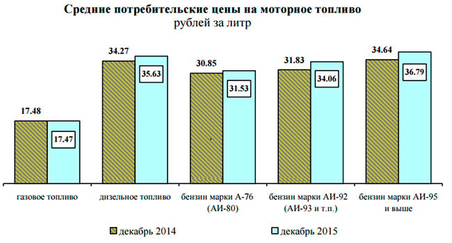 По информации статистического ведомства, стоимость 1 литра бензина марки А-76 (АИ-80) за прошедший год выросла на 68 копеек и сейчас составляет 31 руб. 53 копеек. Цена на АИ-92 (АИ-93) за год выросла на 2,23 рубля - до 34 руб. и 6 коп. АИ-95 подорожал на 2,15 рубля - до 36 руб. 79 коп. Также сильно за год выросли цены на дизельное топливо, которое сейчас стоит 35 руб. 63 коп (+1,36 руб. к показателю 2014 года). Цена газового топлива не изменилась. Сейчас литр газового топлива стоит 17 руб. 47 коп. (-1 копейка к показателю 2014 года).